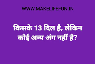 वैसे अगर आप अपने दिमाग को मजबूत बनाना चाहते हैं तो पहेलियां आपकी मदद कर सकती हैं क्योंकि एक शोध में पाया गया है कि पहेली सुलझाने से दिमागी क्षमता दुगनी तेजी से बढ़ता है| और हमारी यह पहेलियां आपके दिमाग की अच्छी कसरत करवाएंगे, आप हमारी वेबसाइट www.makelifefun.in पर जा कर हर केटेगरी की पहेली का मजा ले सकते है
